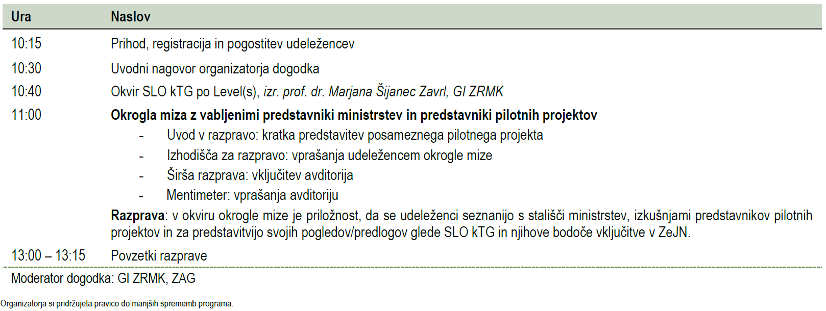 Na okrogli mizi bo potekala razprava o izkušnjah uporabe SLO kTG na pilotnih primerih in o možnostih njihove uporabe v praksi, predvsem pri načrtovanju in v procesu zelenega javnega naročanja. V ta namen je vzporedno s pilotno uporabo SLO kTG potekal pregled metodologije s strani MNVP. V obe obravnavani tematiki želimo vključiti vse udeležence dogodka in jih spodbuditi v razpravo o ovirah, priložnostih in njihovih potrebah.